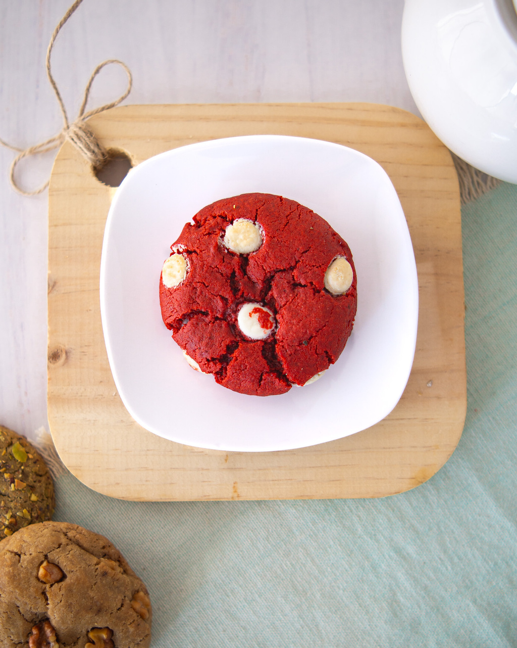Galleta de red velvet con chips de chocolate blanco y un cremoso corazón de ganache blanco. Delicadeza en cada bocado