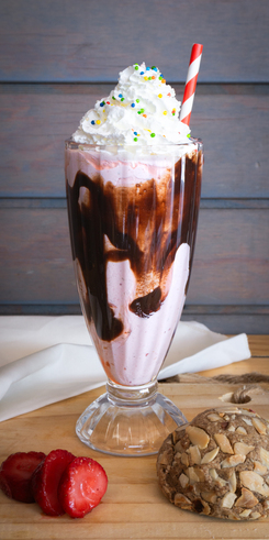 Milkshake cremoso que combina frutilla y helado de vainilla coronado con suave crema batida y un toque de salsa de chocolate o manjar, Que lo convierte en el sueño rosado mas dulce y refrescante.