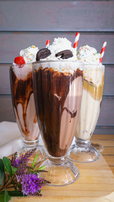 Milkshake cremoso que combina un helado cremoso de lúcuma con manjar o lúcuma con chocolate coronado con crema batida y salsa de chocolate o manjar a tu elección es pura dulzura en cada sorbo.