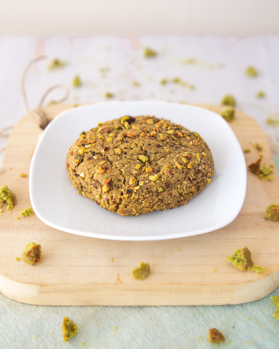 Galleta de vainilla con trozos de pistachos y chips de chocolate blanco y un cremoso corazón de chocolate blanco. Un placer irresistible.